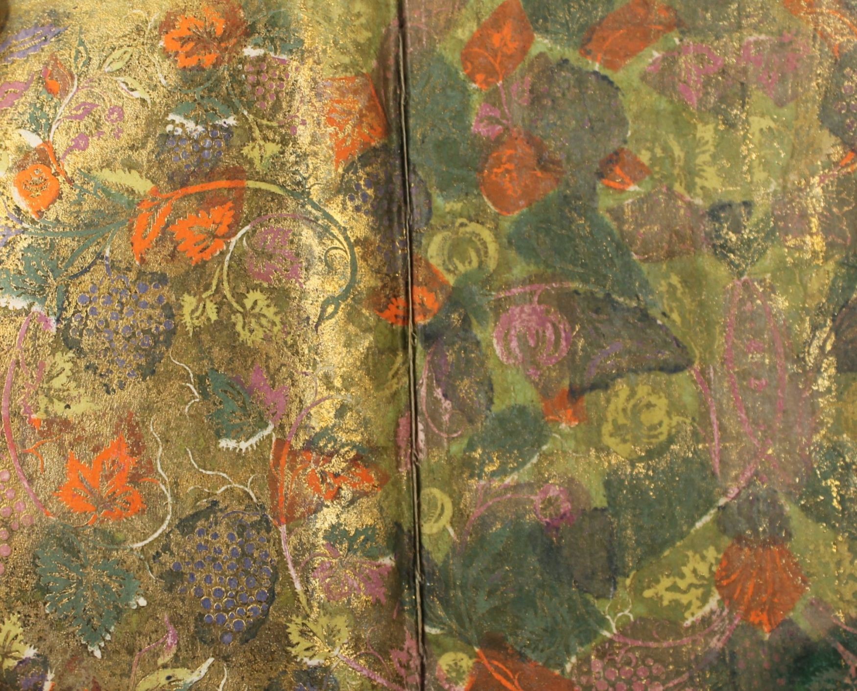 La carta è stata realizzata attraverso l’impressione su sfondo oro di motivi con foglie di vite e grappoli ed altre tipologie di frutti che in seguito sono stati rifiniti a pennello con colori verde, viola, arancione e rosa.