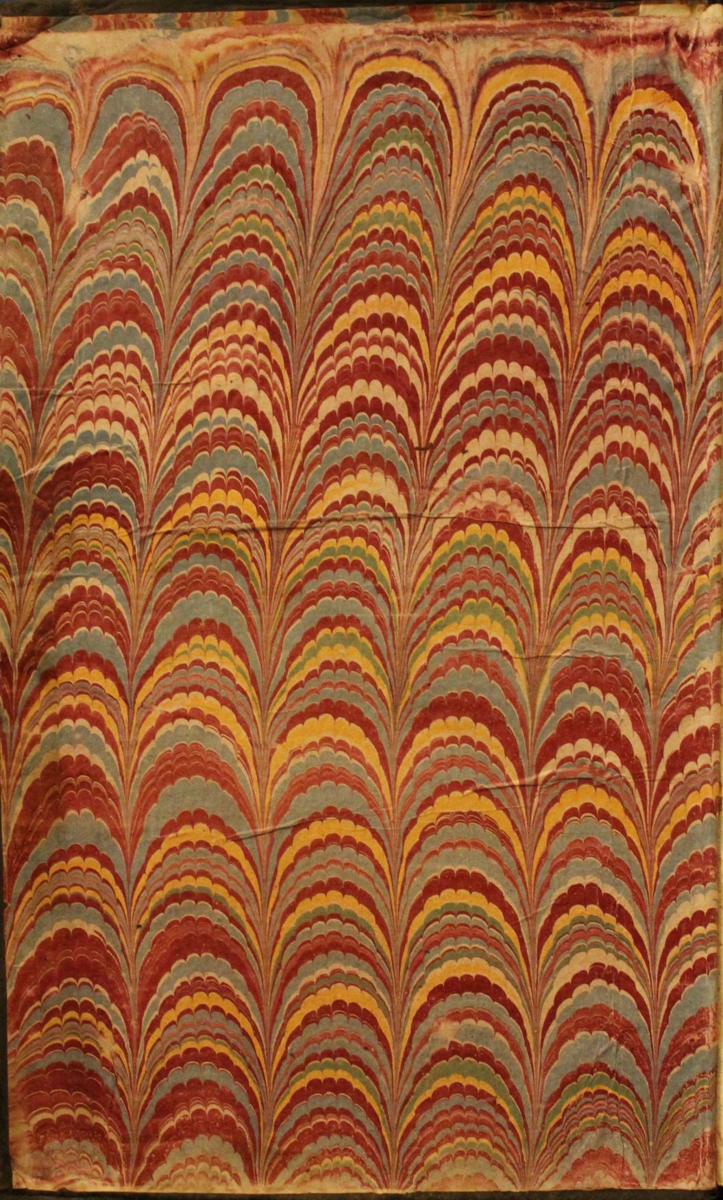 La carta marmorizzata presenta un motivo peigné. Il motivo è stato realizzata attraverso la lavorazione con un pettine di gocce di colore, rosso, verde, bianco, azzurro, giallo, in sospensione in una soluzione acquosa a cui è stata aggiunta della gomma adragante. In questo caso oltre all’effetto pettinato è stato impresso un motivo a balze. Probabilmente si tratta di una carta realizzata in ambito francese nella prima metà del XVIII secolo.