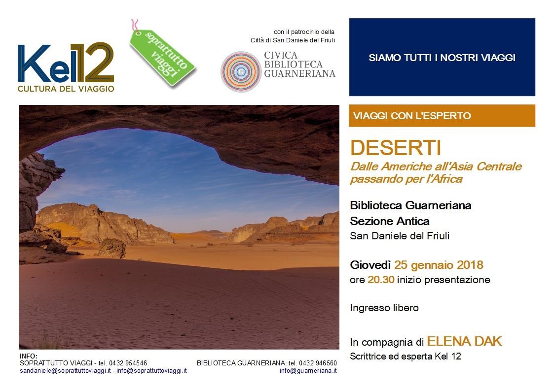 Incontro con Elena Dak, scrittrice ed esperta per il tour operator Kel12, che condurrà il pubblico attraverso i deserti che ha conosciuto nei suoi viaggi: dalle Americhe all'Asia Centrale, passando per l'Africa.