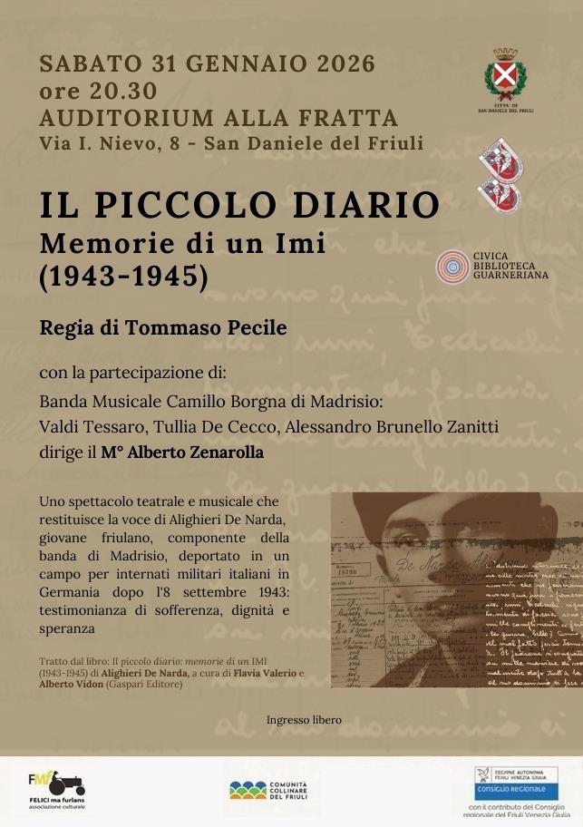 Sabato 31 gennaio 2026, alle ore 20.30, si terrà uno spettacolo unico che unisce teatro e musica: “Il piccolo diario – Memorie di un IMI (1943-1945)”, con la regia di Tommaso Pecile, presso l’Auditorium Alla Fratta di San Daniele del Friuli (Via I. Nievo, 8).