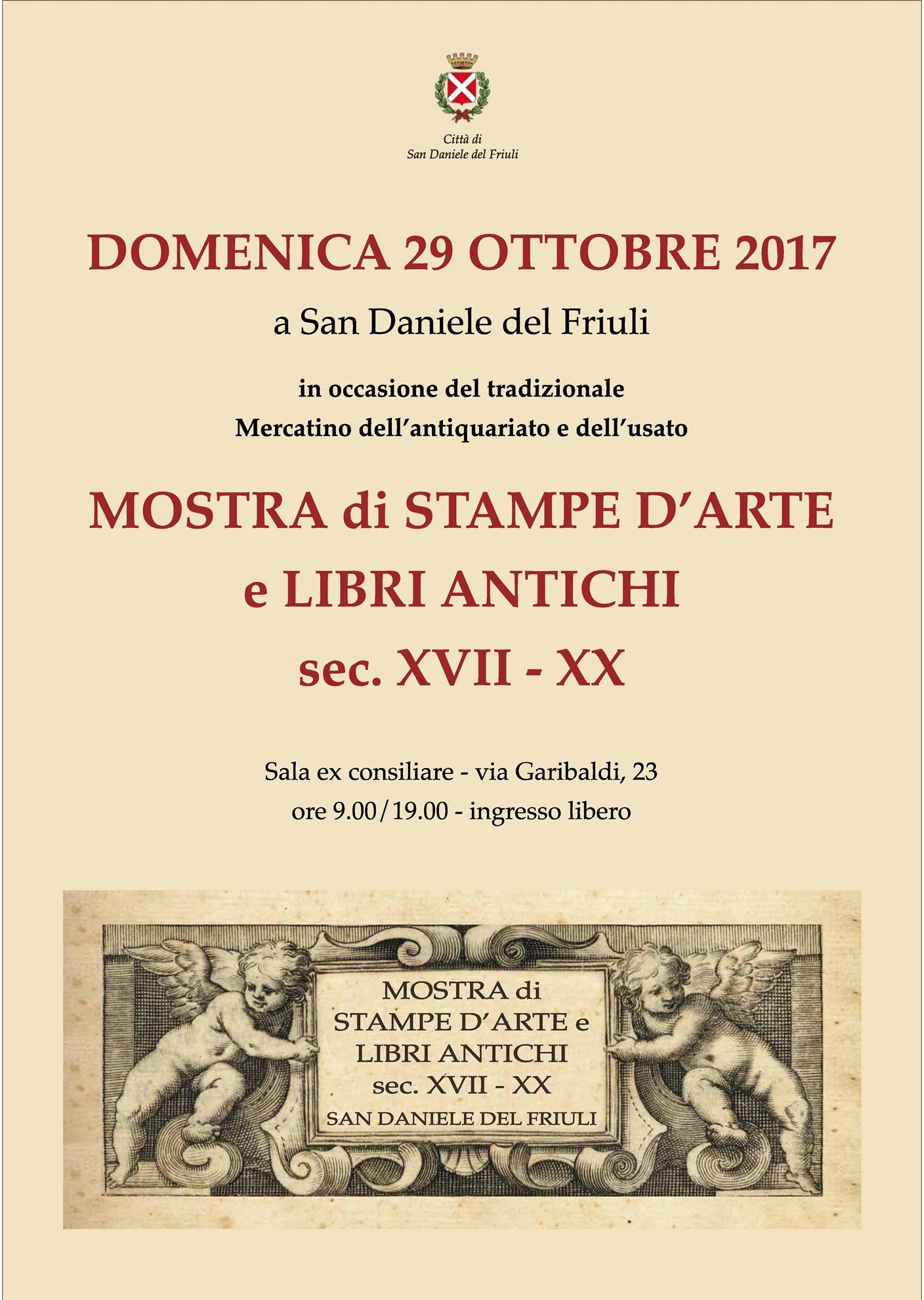 In occasione del tradizionale Mercatino dell'antiquariato e dell'usato nel centro storico di San Daniele, nella Ex Sala consiliare in Via Garibaldi n. 23, mostra di stampe d'arte e libri antichi (sec. XVII-XX).