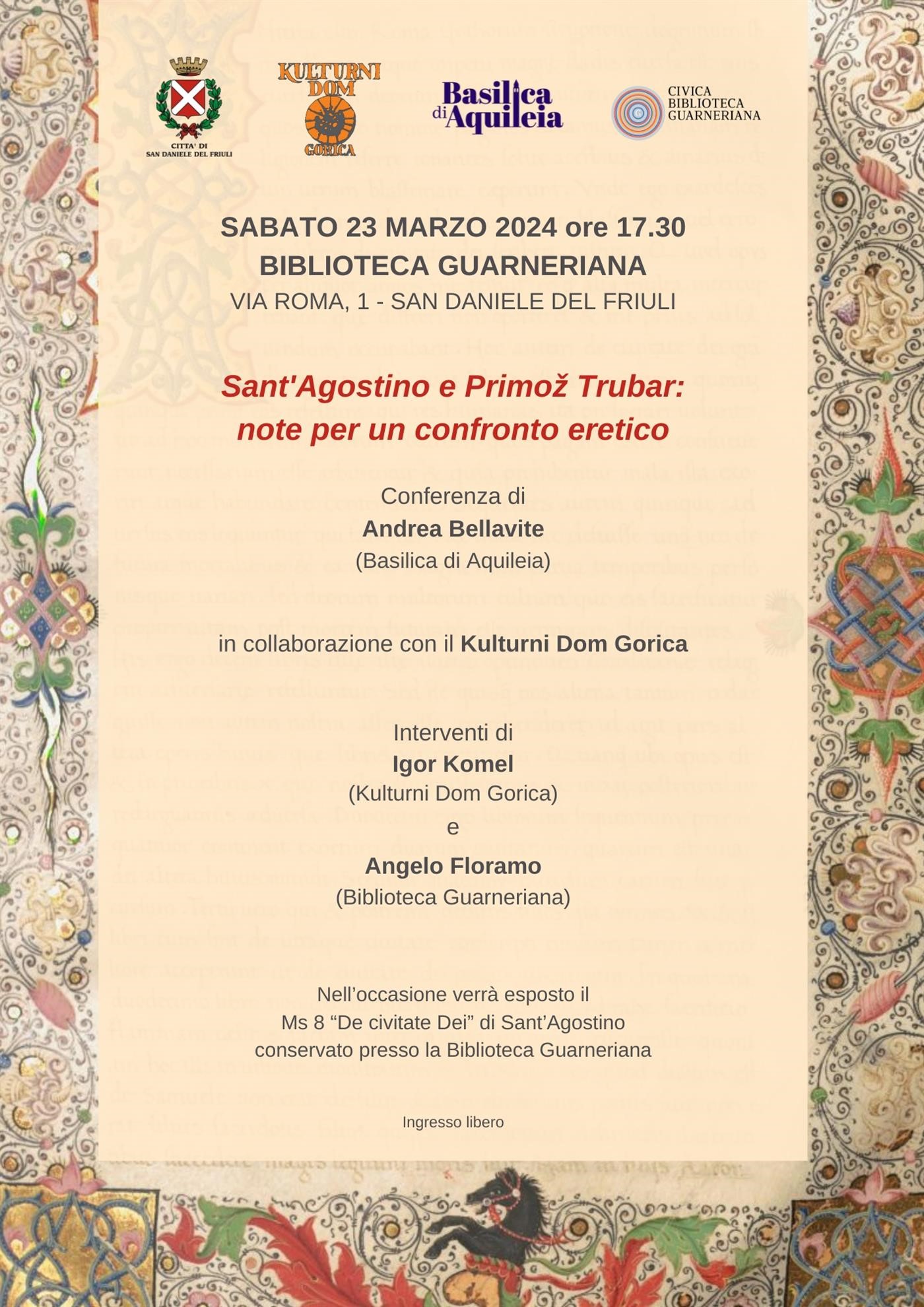 Sabato 23 marzo 2024 alle ore 17.30 in Biblioteca Guarneriana, si terrà la conferenza Sant'Agostino e Primož Trubar: note per un confronto eretico di Andrea Bellavite (Basilica di Aquileia), in collaborazione con il Kulturni Dom Goriza.
