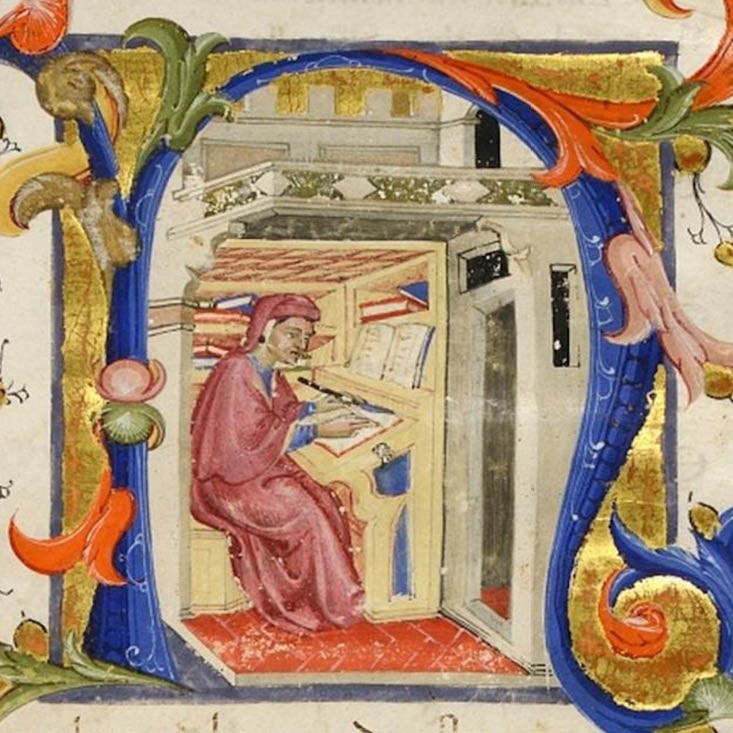 Il ms. 200, acquistato da mons. Giusto Fontanini nel 1717, fu trascritto probabilmente a Firenze dai notai Paolo Puccini e Pietro Bonaccorsi tra la fine del Trecento e gli inizi del Quattrocento, ed è arricchito nella prima parte da tre splendide miniature attribuibili a Bartolomeo di Fruosino, uno dei più grandi illustratori fiorentini, la cui arte fu importante per lo sviluppo della miniatura fino alla seconda metà del Quattrocento. Meravigliosa la miniatura a carta 2 recto, con il Sommo Poeta ritratto nell’iconografia già consolidata, con la veste rossa, ampia, lunga, con un copricapo bianco aderente alla testa e con le punte a coprire le orecchie, cui è sovrapposto un berretto nella stessa stoffa dell’abito con un ricasco a cappuccio: Dante è nel suo studiolo, allo scrittoio, con il calamo in mano, perfettamente incorniciato nella lettera N, color blu cobalto, che principia la Commedia. Il testo è corredato da due importanti commenti, uno in volgare di autore non ancora identificato, e l’altro in latino, a firma di Graziolo de’ Bambaglioli, notaio bolognese, considerato fra i primi commentatori di Dante. Il codice si presenta come un vero e proprio laboratorio, quasi un cantiere aperto: oltre ai commenti compare una parziale traduzione del testo in esametri latini, l’impostazione grafica della pagina muta notevolmente nei diversi fascicoli, e dopo le prime tre miniature policrome ne appaiono altre stilisticamente molto diverse, acquerellate (come quella che ritrae Cerbero a carta 15 verso) o a penna di mano più tarda (come quella raffigurante la palude Stigia a carta 19 verso), mentre dopo carta 20 non vi sono più illustrazioni ma spazi bianchi ancora da riempire.